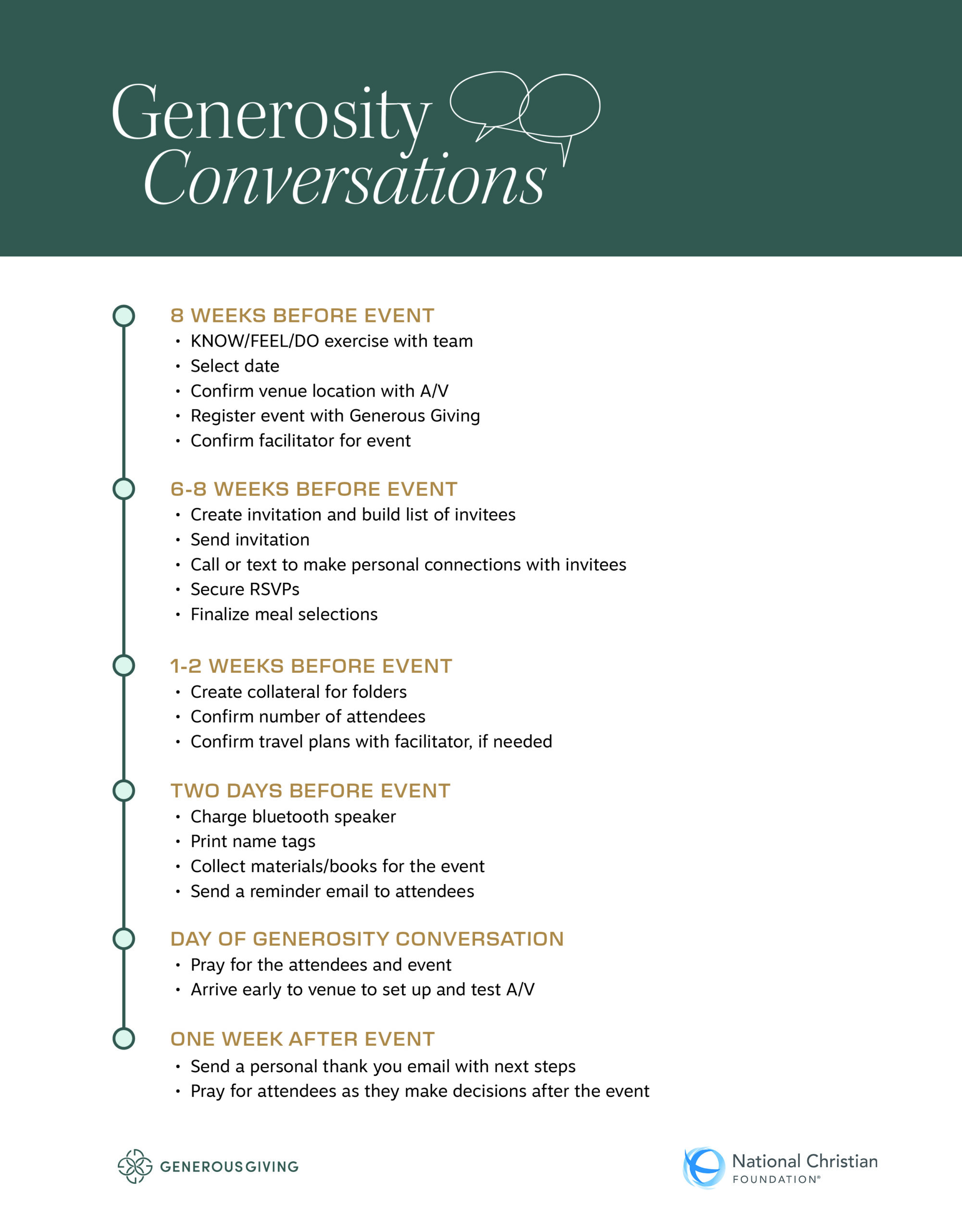 To host a successful Generosity Conversation, we have created a timeline and an exercise to rally your team around the event. These plans are flexible and can be altered to fit your unique market.